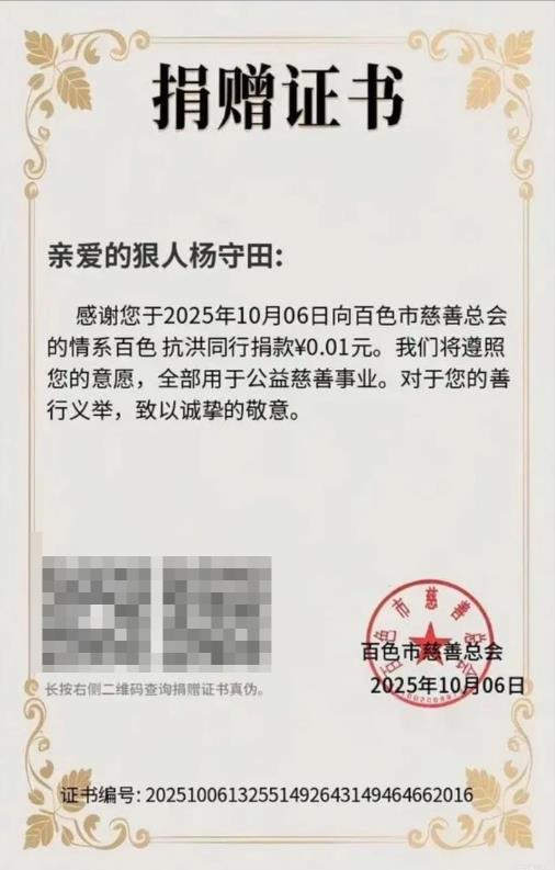 刚刚刷到一条热搜,让我愣了三秒:一位拥有23万粉丝的博主,为百色水灾捐了1分钱,还晒出了捐赠证书。刚看到时我和很多人一样,第一反应是“这是在搞笑吗?”但当我深入了解背后的故事,却发现这个看似荒诞的事件,折射出许多值得我们深思的温暖细节。