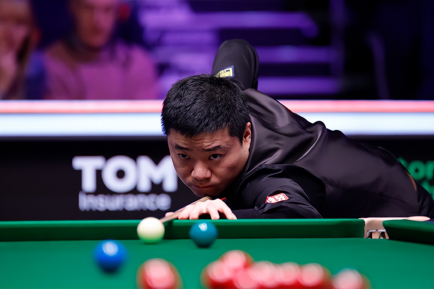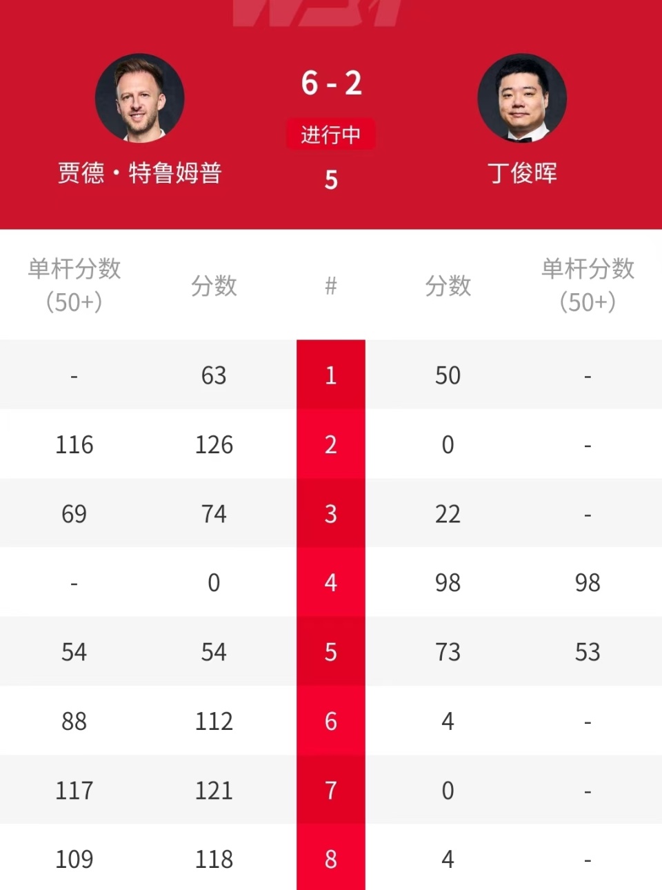 遗憾的是,上述情况没有发生。比赛第一局,特鲁姆普先拔头筹。接下来的两局比赛,特鲁姆普轰出一杆破百和一杆50+,连胜两局之后,比分优势扩大到3-0。丁俊晖随后回敬两杆50+,连扳两局将比分追成2-3。