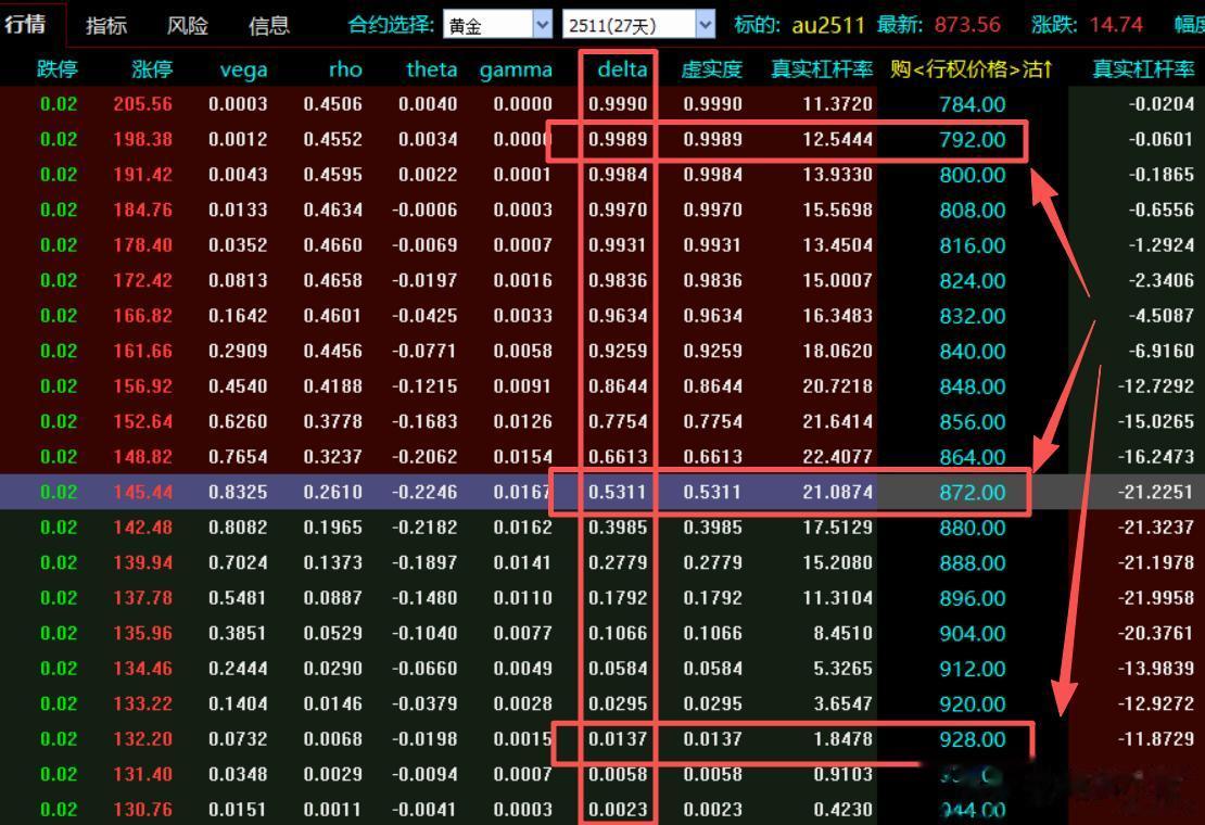 接下来上上强度,有老铁反映期货价格上下波动,自己买的期权怎么不跟着动?这个就要用期权重要的指标“德尔塔”来帮你解疑答惑。