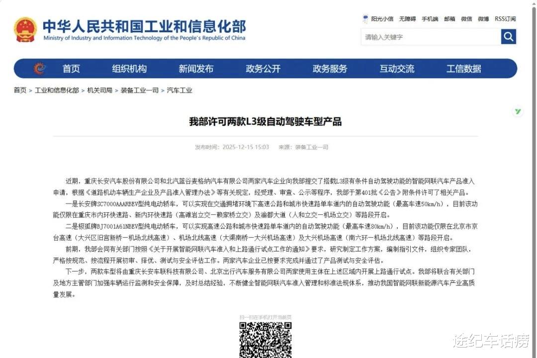官宣炸裂!12 月 15 日工信部放出大招,我国首批 L3 级自动驾驶车型正式获批准入✨!长安、极狐两款 “智能座驾” 杀出重围,在北京、重庆指定路段开跑试点!这波操作直接改写国内智能出行格局 —— 车真能自己开了?普通人啥时候能入手?出事了算谁的?今天用大白话扒透所有关键信息,看完再也不用猜~