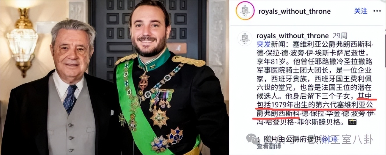 2025年5月,西班牙第五代塞维利亚公爵弗朗西斯科病逝,享年81岁。他在1968年跳位继承奶奶的头衔(老爹放弃了继承)