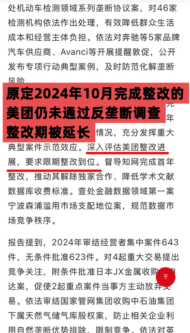 2025年6月被写入《中国反垄断执法年度报告(2024)》,也意味着自2021年至今,美团的整改仍未通过国家市场监管总局的审核,将继续推动美团整改,并限期整改到位。而截至目前,美团从未公开过参照该行政指导书进行整改的情况,外界也无法对其整改履行情况进行监督。