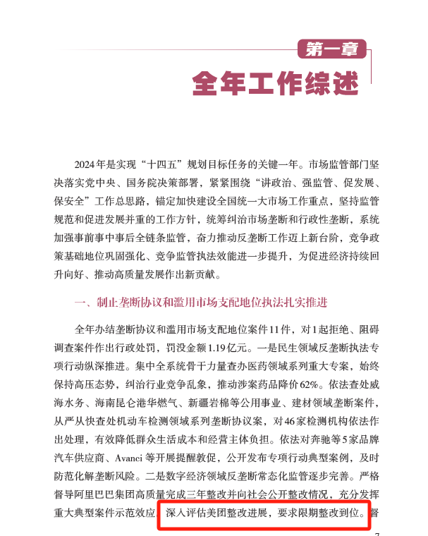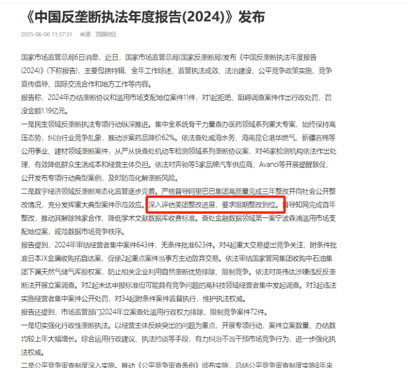 6月6日,国家市场监管总局(国家反垄断局)发布《中国反垄断执法年度报告(2024)》(下称报告),主要包括特辑、全年工作综述、监管执法成效、法治建设、公平竞争政策实施、竞争宣传倡导、国际交流合作和地方工作等内容。报告特别关注了数字经济领域的反垄断监管工作,指出已逐步建立起常态化的监管机制。报告中将美团作为典型案例,提及“深入评估美团整改进展,要求限期整改到位”,这也意味着原定于24年10月完成整改的美团仍未通过反垄断调查,市监局将持续推动其向社会公开整改进展。