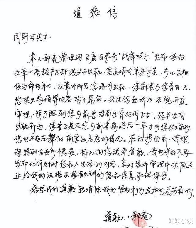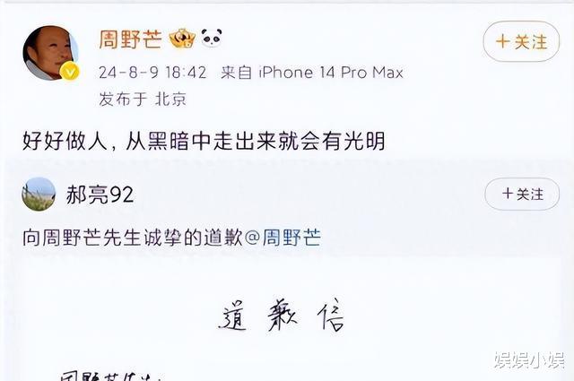 周野芒澄清后,郝亮手写信网络疯传,信中否认其出轨,并说明与前妻无子女。该信获周野芒附文转发,显然是对信中内容的认可。