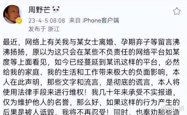 事发突然,众人皆指周野芒对奚美娟不忠,致其月子中携子离婚。且他离婚后迅速另娶,更让网友确信其婚内出轨,纷纷对周野芒展开抨击。