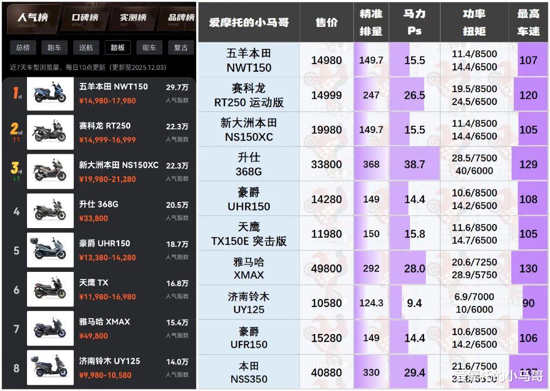 刚也说了,它这个价格其实已经能上250级别的踏板了,所以如果对动力体验有要求的基本就可以挥手告别了。但如果你只是市区代个步,逛逛菜市场,接送一下孩子,那么它这15.5匹的发动机还是够用的。而且放到同级别中还属于中上游的水平呢!所以动力平台是五羊本田NWT150的一大加分项!对得起“买发动机送车”的名头。(下图是踏板热度排行榜前十车型的动力对比)