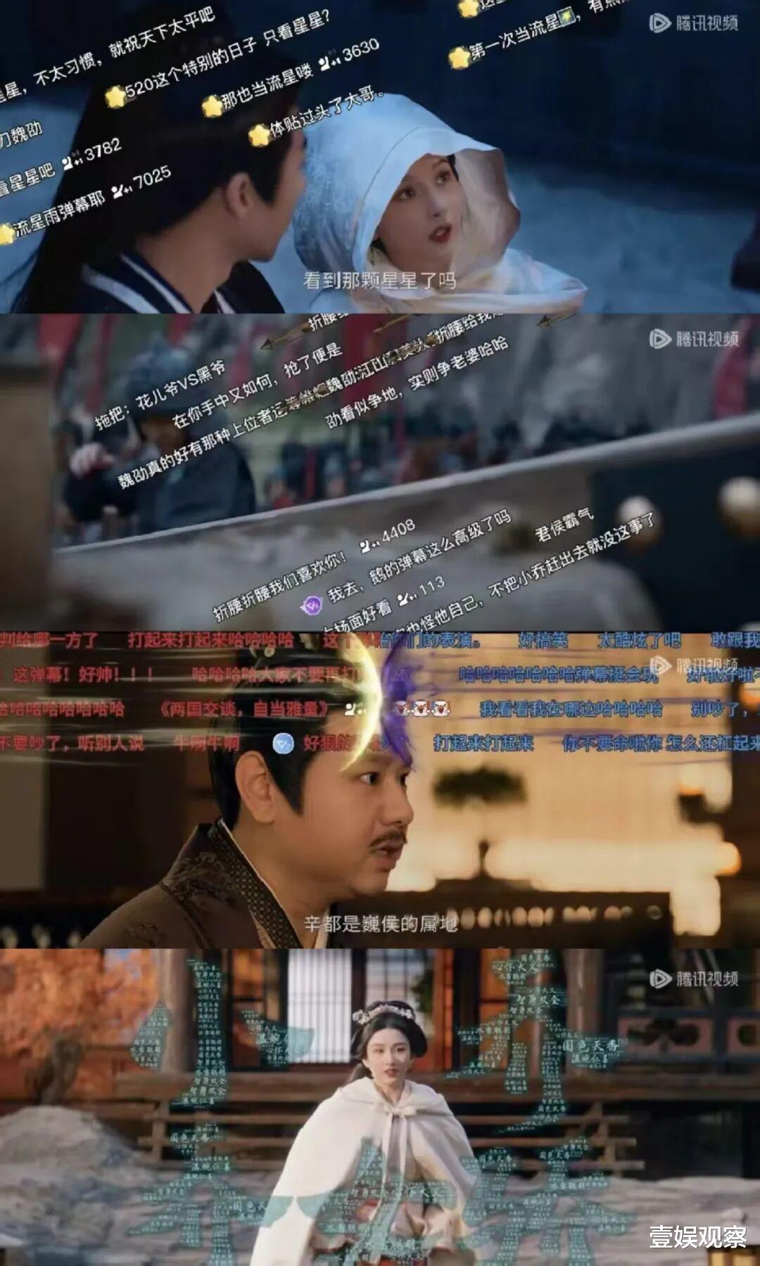 以《折腰》为例,配合剧情,回忆戏的时候是弹幕倒流、剧里在着火弹幕也在着火,弹幕一会儿成为流星雨、一会儿又是万箭齐发,甚至连主角辩论的时候弹幕又能成为红蓝对峙,到了男女主高光时刻,弹幕化身男女主最强应援,集结成为各自的“霸气人设”……