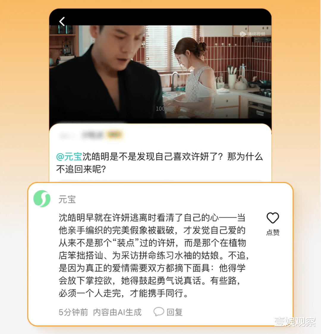 腾讯视频之前就与腾讯元宝完成了内部打通,用户从此可以一站式解决“看片、找片、剧荒、聊剧”的需求,之后更是结合混元大模型,在《许我耀眼》等热播剧中推出了混元AI分身互动功能。