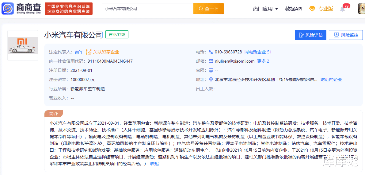 商商查显示,小米汽车有限公司成立于2021-09-01,法定代表人是雷军,经营范围包含:新能源车整车制造;汽车整车及零部件的技术研发;电机及其控制系统研发;技术服务、技术开发、技术咨询、技术交流、技术转让、技术推广等。