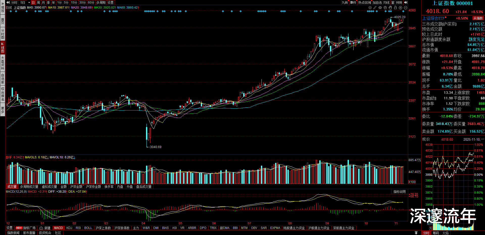 2025 年 11 月 10 日的市场数据正印证着既定的运行轨迹。上证指数站稳 4018 点后,距离前期预测的 4500