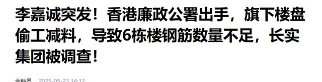 金融界2025-05-23 16:12|——李嘉诚突发!香港廉政公署出手,旗下楼盘偷工减料,导致6栋楼钢筋数量不足,长实集团被调查!