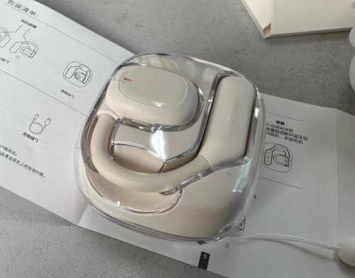 在结构上使用的是新形态耳夹设计,耳机外壳还是全透明式结构,看起来很特别;重量的话,单耳是5.7g,不是很重,但是材质一般,偏硬,戴着会有点痛不舒服,对于那种长时间佩戴耳机办公娱乐的人不是很友好。