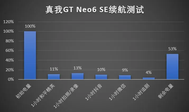 真我GT Neo6 SE内置一颗高达5500mAh大容量电池+100W有线快充组合。还有AI节电引擎和更低能耗的8T LTPO无双屏多重加持,完全可以满足用户一天24小时的深度使用需求。而且,高达100W的有线快充技术也大大提升了充电速度,进一步提升了用户的实际续航体验。经实测,在手机满电的情况下,玩1小时《和平精英》耗电11%,拍照/录像1小时耗电13%,刷1小时抖音耗电10%,微信1小时微博耗电9%,观看1小时耗电4%。经过连续5小时高强度使用,手机最终电量剩余53%。整体而言真我GT Neo6 SE日常使用一天毫无压力。