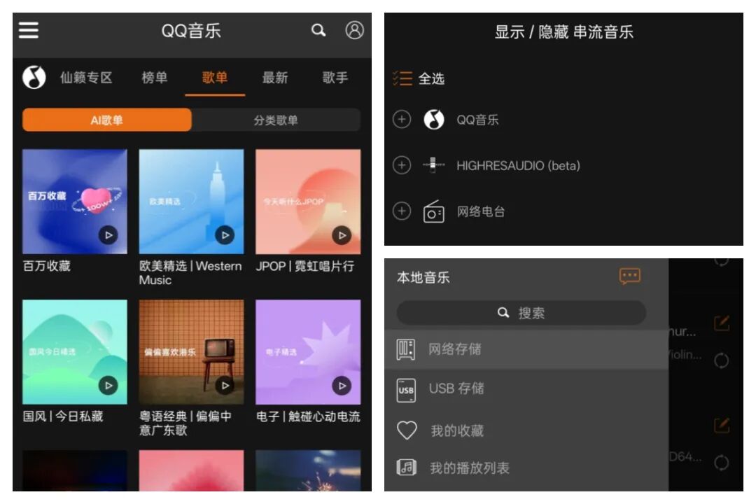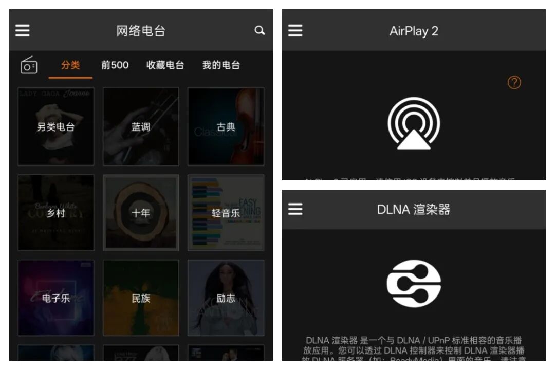 界面可聚焦播放控制,切歌、调音量行云流水;亦可让专辑封面与歌词舒展,视觉与听觉双重沉浸;用手机输入法快速搜歌,指尖拖动即可创建歌单,本地存储的母带文件、QQ音乐无损专辑、NAS存储的经典WAV,以及潮玩的串流airplay2、DLNA,都能统一管理自由调度,甚至,还支持聚合网络电台,可作为一台数字网络HiFi收音机使用——怡然自得驾驭各大音源,沉浸式品鉴HiFi!
