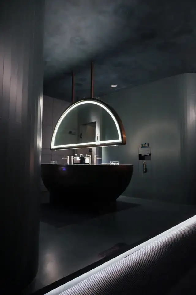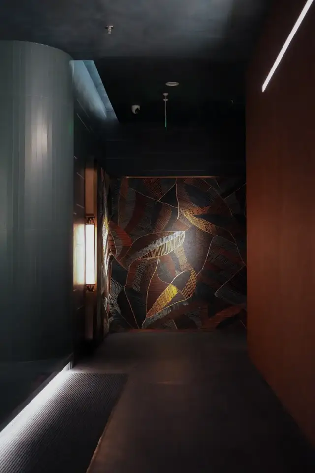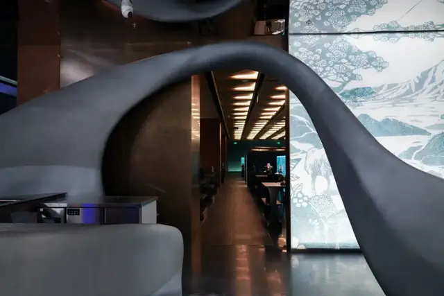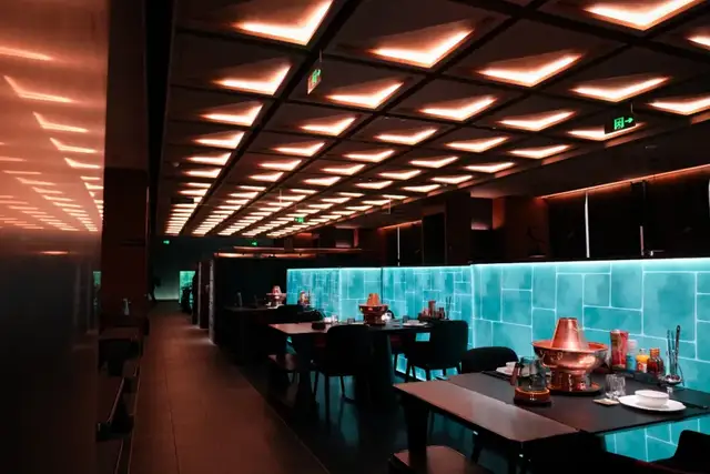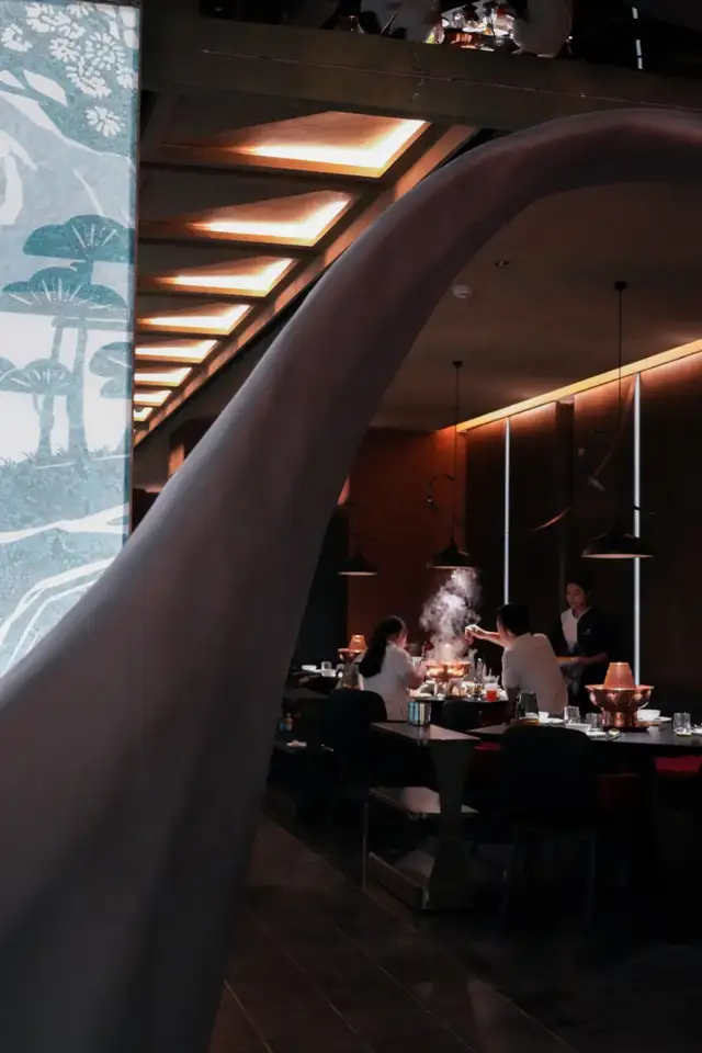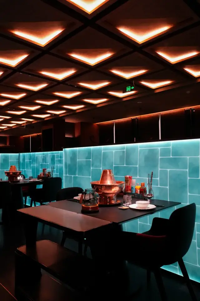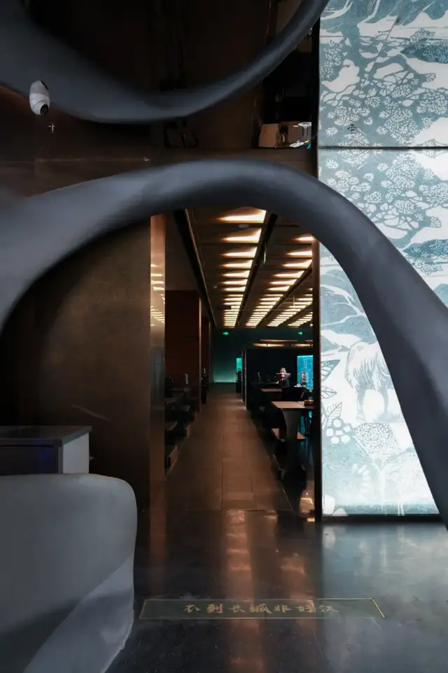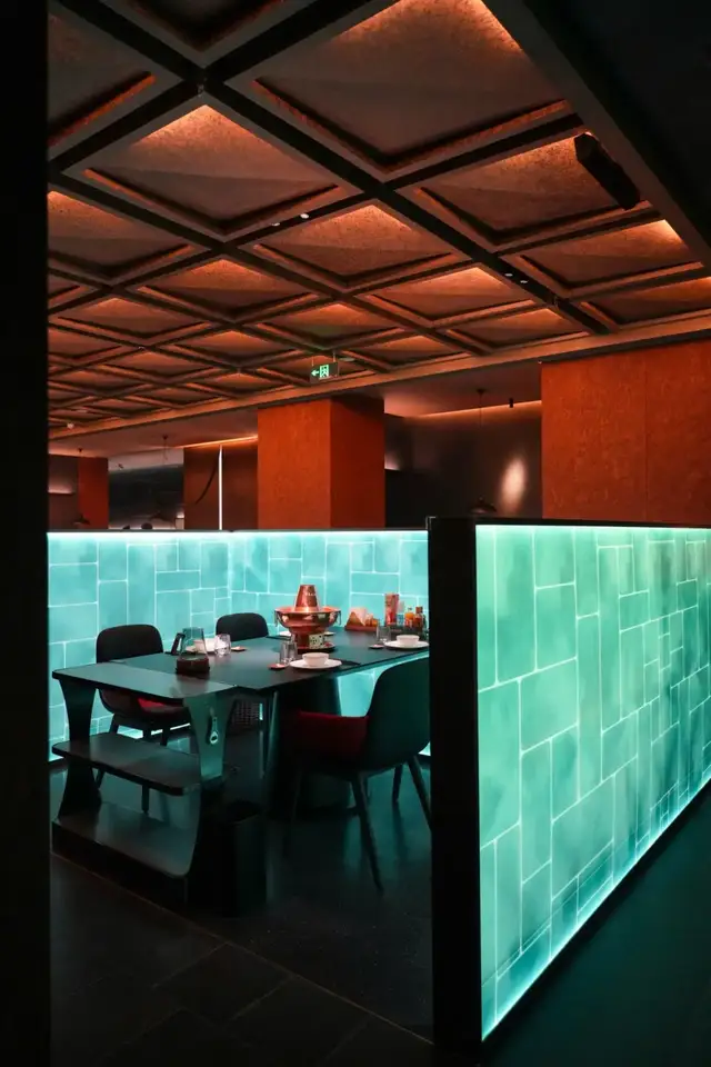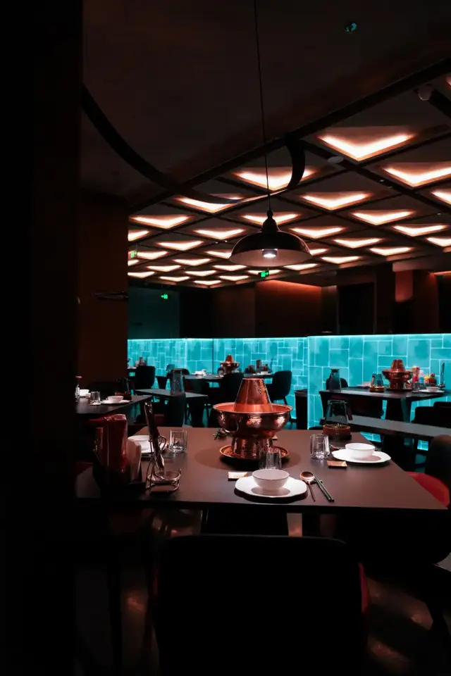 又极具当代艺术审美的设计、还有点赛博朋克的色调冲击,要不是看到桌上的一口大铜锅,谁会想到这是涮羊肉店?