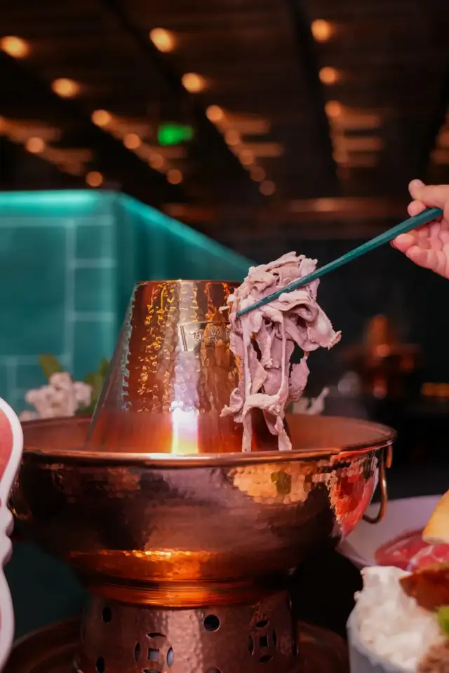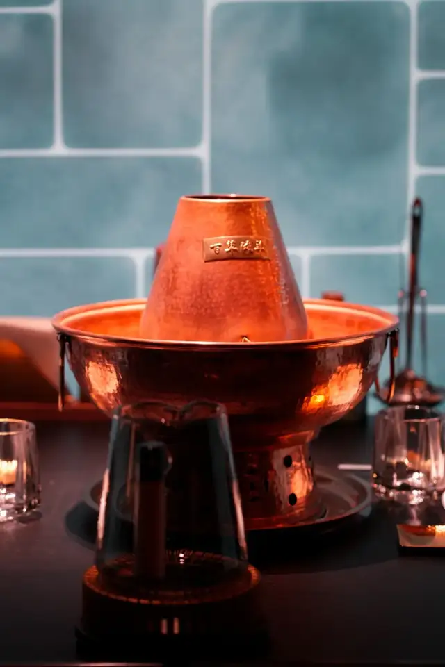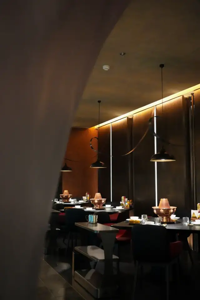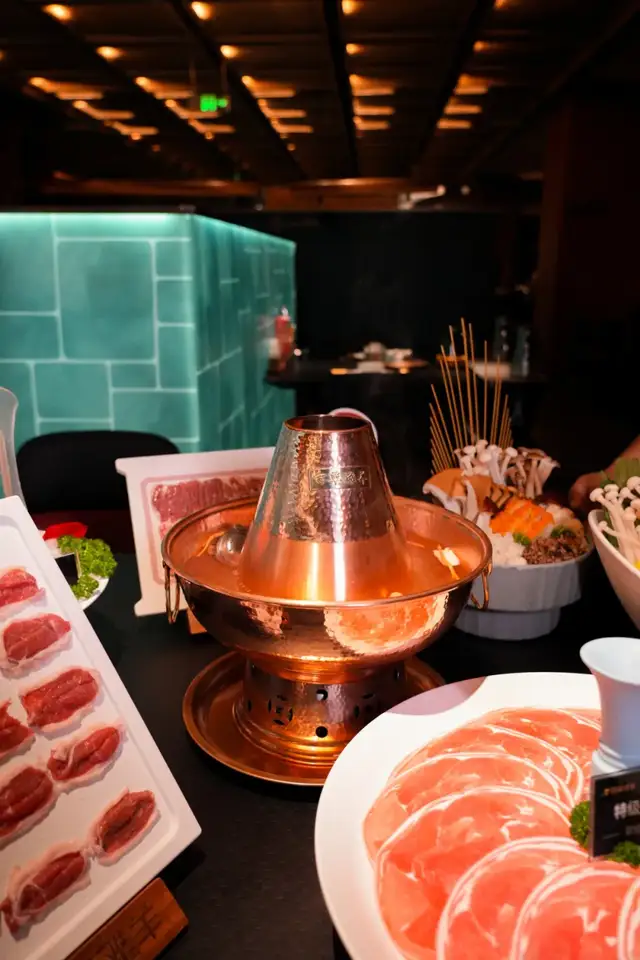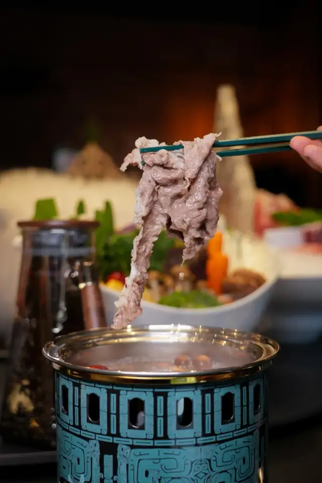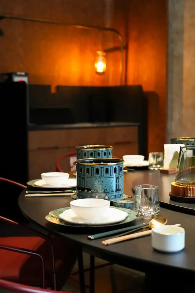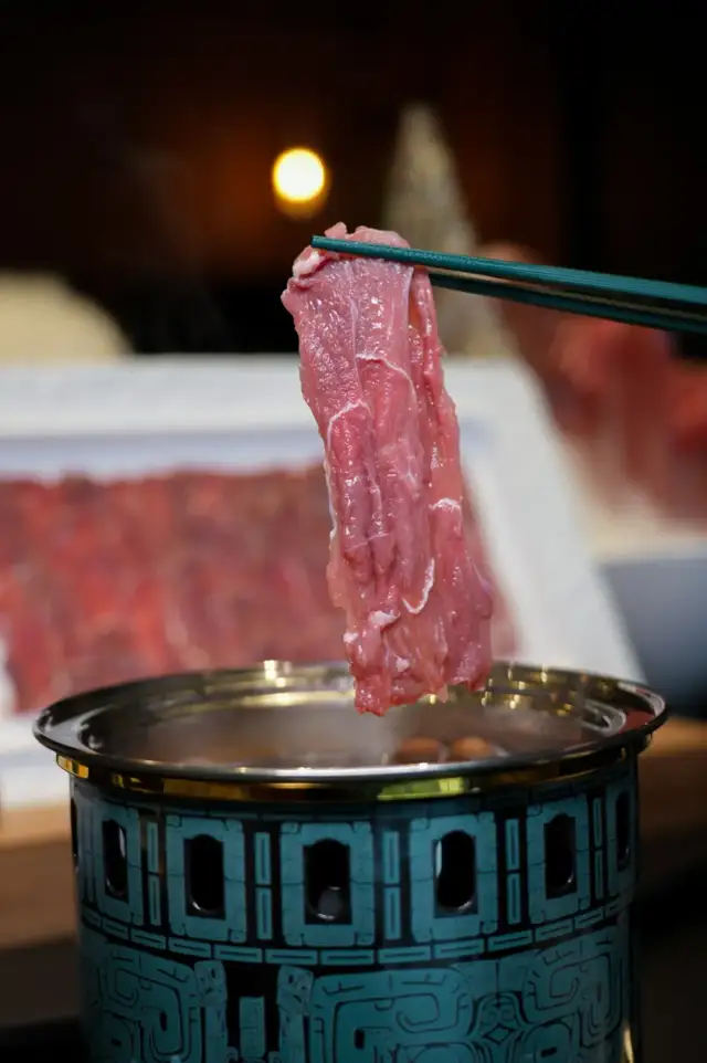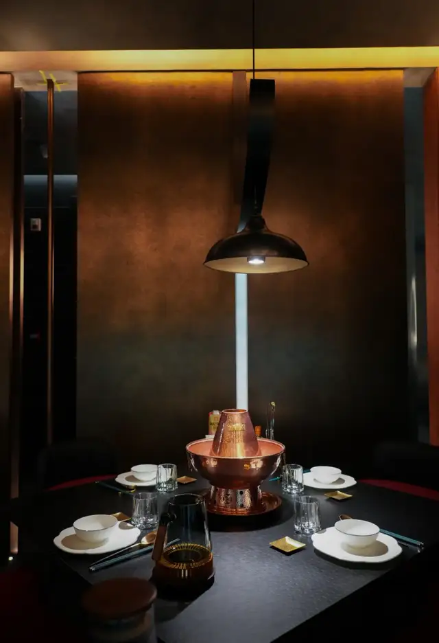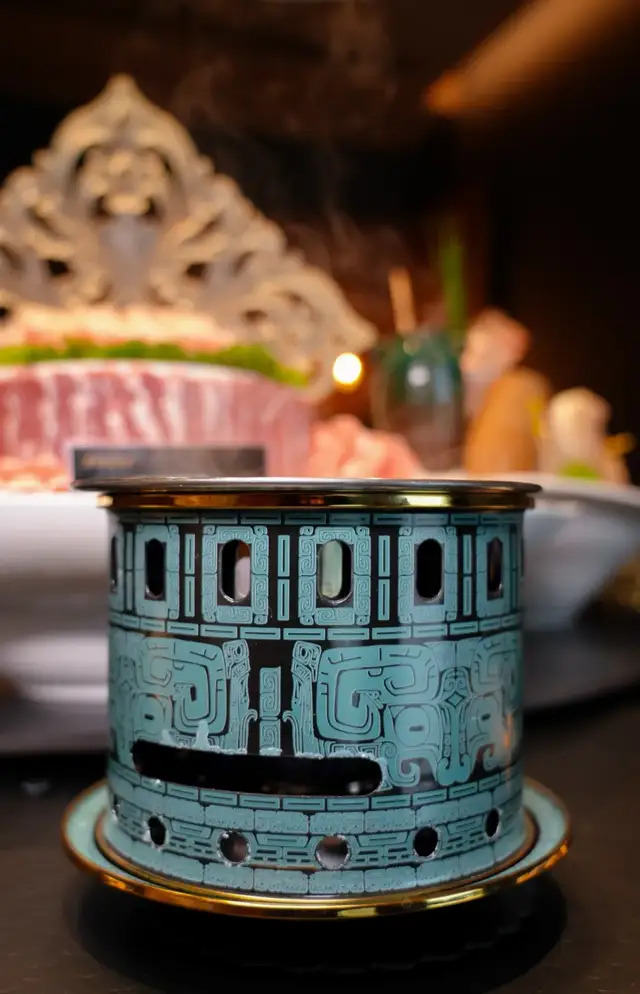 而包间内人人独立的一口小锅,真的是从来没有见过的精致和艺术感,涮肉锅还可以如此艺术,充满美感,青铜元素、纹理的结合既传统又十分时尚、国际化!