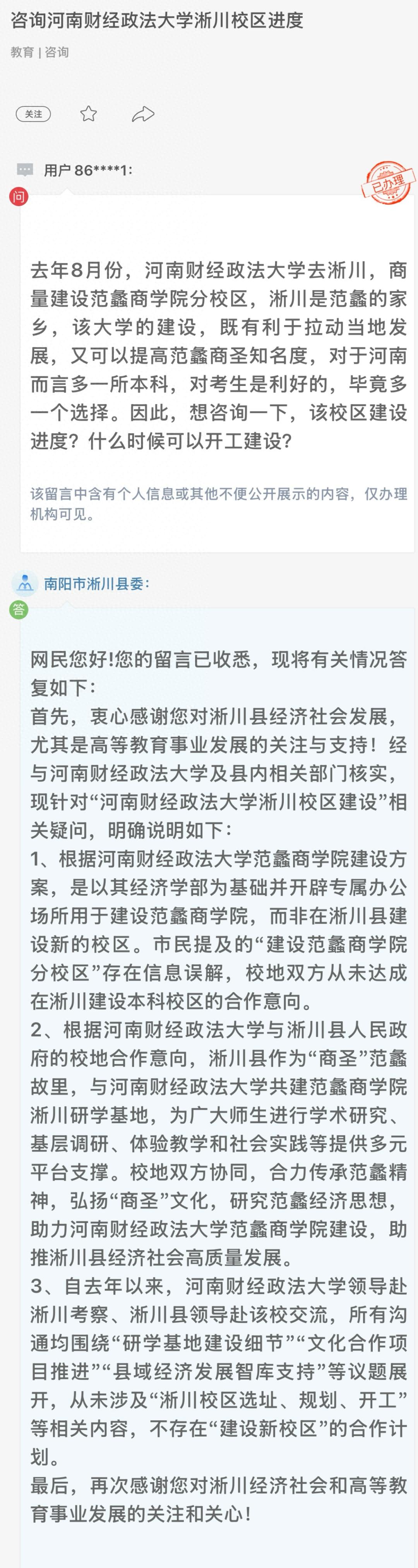 对此,河南省南阳市淅川县委回应: 市民提及的 “建设范蠡商学院分校区”存在信息误解,校地双方从未达成在淅川建设本科校区的合作意向。 淅川县作为“商圣”范蠡故里, 与河南财经政法大学共建范蠡商学院淅川研学基地 ,为广大师生进行学术研究、基层调研、体验教学和社会实践等提供多元平台支撑。 不存在 “建设新校区”的合作计划 。