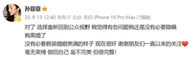 近日,知名女星孙菲菲官宣离婚,她在社交平台发布长文,“我离婚了,没有必要假装婚姻美满的样子,现在很好 谢谢朋友们一直以来的关注。毫无束缚 做回自己 虽不完美 但很完整!”引爆舆论。