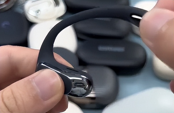 佩戴上,说用的是空气挂耳设计,整体的佩戴感受就是亲肤性很高长时间戴很舒适。就是耳机的机身有有一些些偏重,不过整体的质感不错。