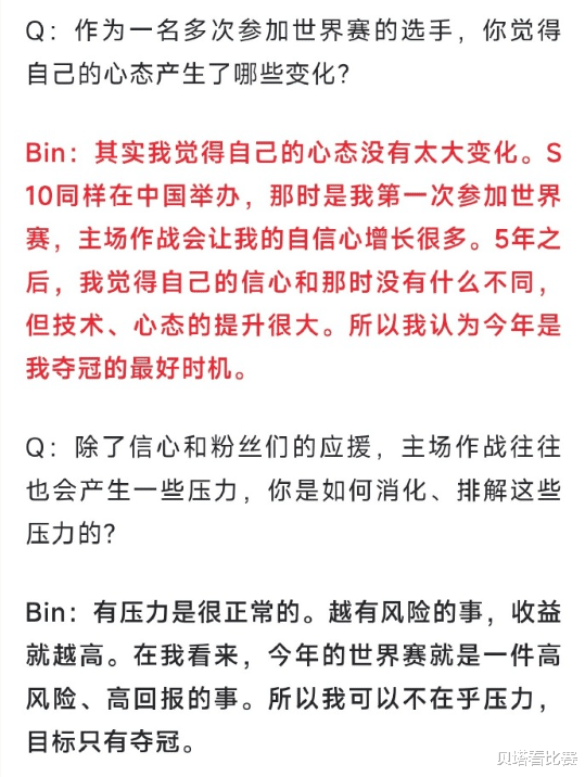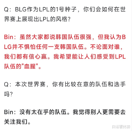 值得一提的是赛前采访的时候,BLG上单bin又是放话:不惧怕任何一支韩国队伍,面对任何队伍都有信心获胜,也没有在意的队伍,反而是其他队伍需要关注BLG!