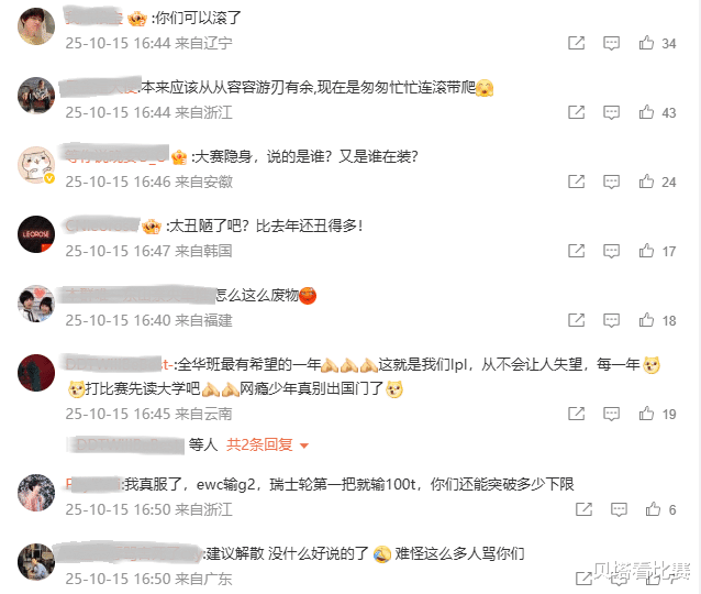 BLG官博下方的评论如下,不少粉丝怒斥:本以为游刃有余的胜利,没想到是连滚带爬的落败!输得太丑陋了,比去年还丑,到底还要突破多少下限,难怪这么多人骂你们!也有粉丝批评Knight和bin:一个大赛隐身,一个喜欢装!