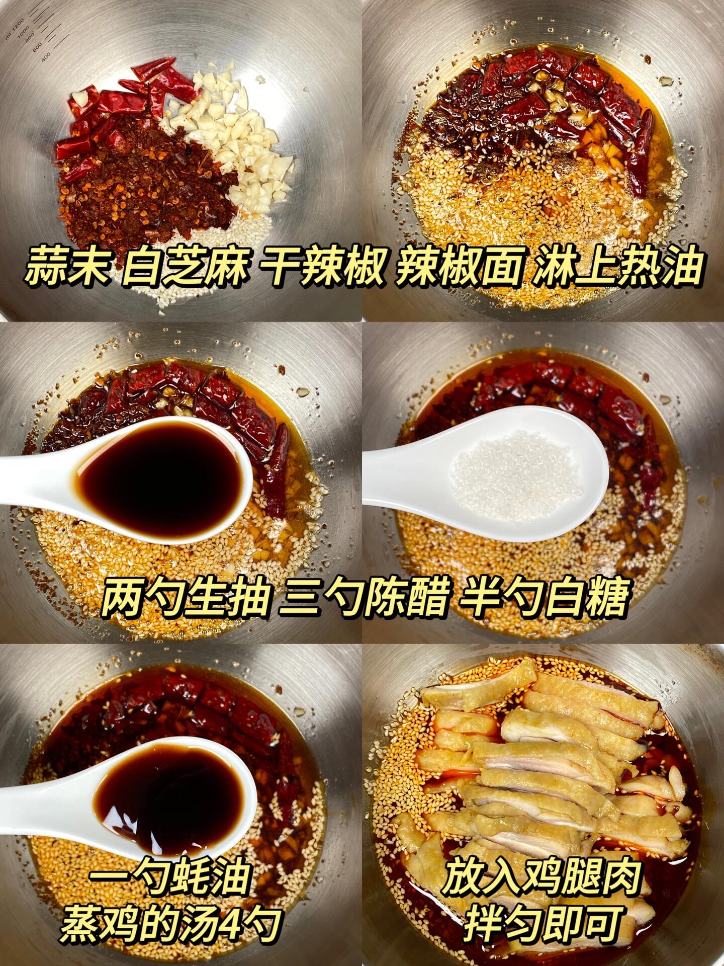 口水鸡的灵魂,在于那碗红亮诱人的酱汁。取一小碗,放入蒜末、白芝麻、干辣椒和辣椒面,然后淋上热油,瞬间激发出香味。接着,加入两勺生抽、三勺陈醋、半勺白糖、一勺蚝油,以及蒸鸡时留下的四勺鸡汤,搅拌均匀。这碗酱汁,集合了酸、甜、辣、鲜、香多种味道,是口水鸡的点睛之笔。