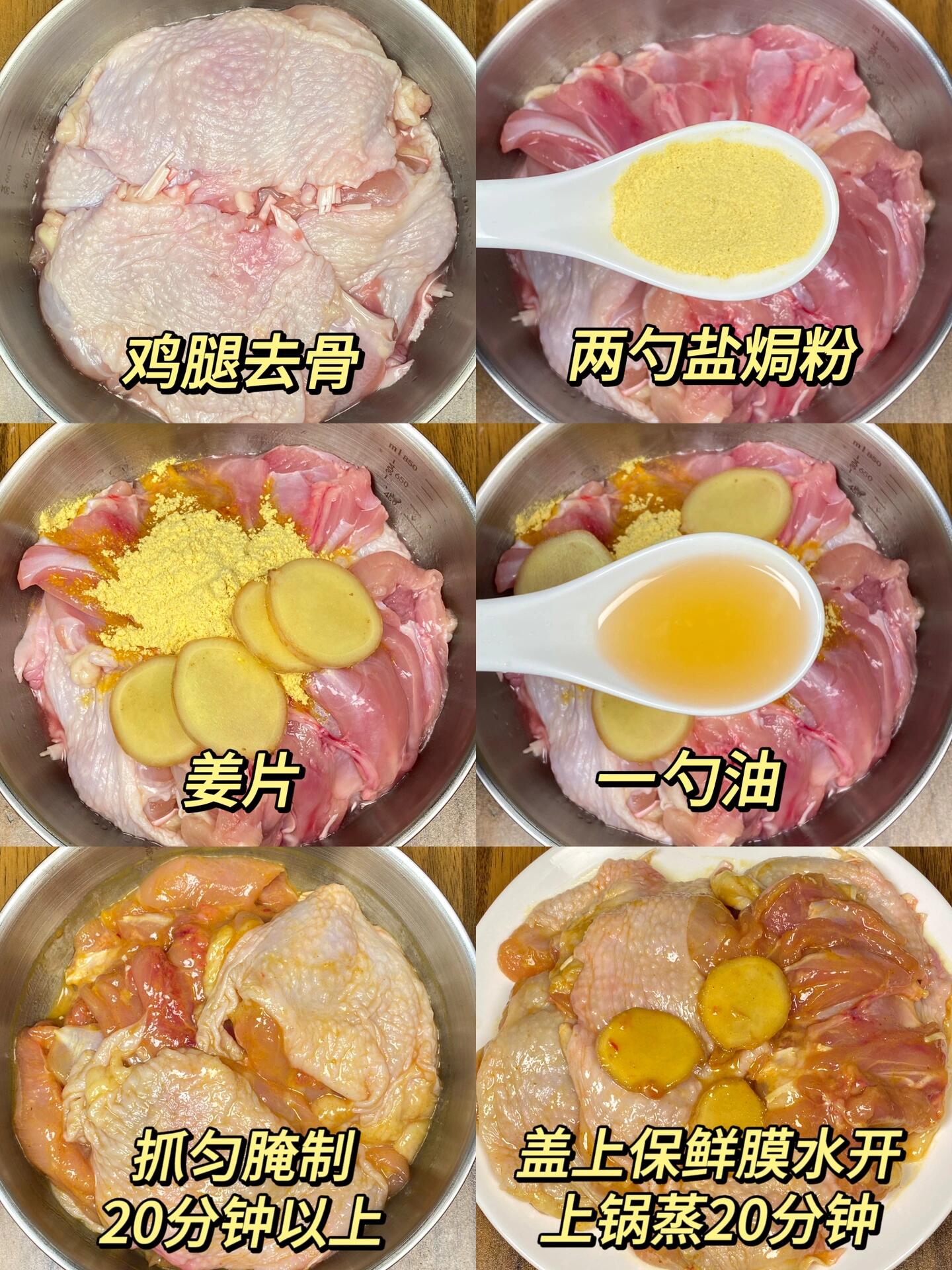 腌制好的鸡腿肉,盖上保鲜膜,等水开后上锅蒸20分钟。蒸的时间不宜过长,否则鸡肉会变老,影响口感。蒸好的鸡肉取出,放凉后切成条状,摆入盘中。这一步,鸡肉的嫩滑和蒸制的火候息息相关,火候恰到好处,鸡肉才能达到最佳的口感。