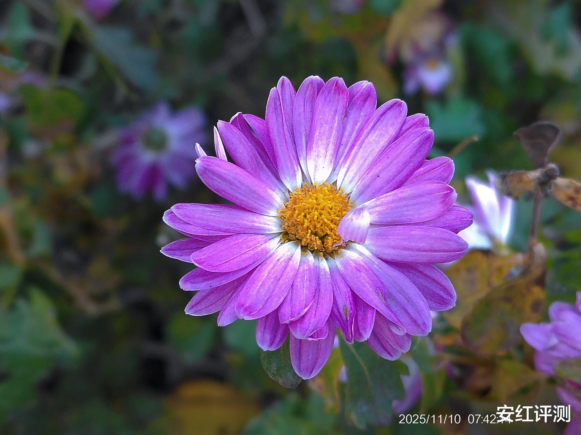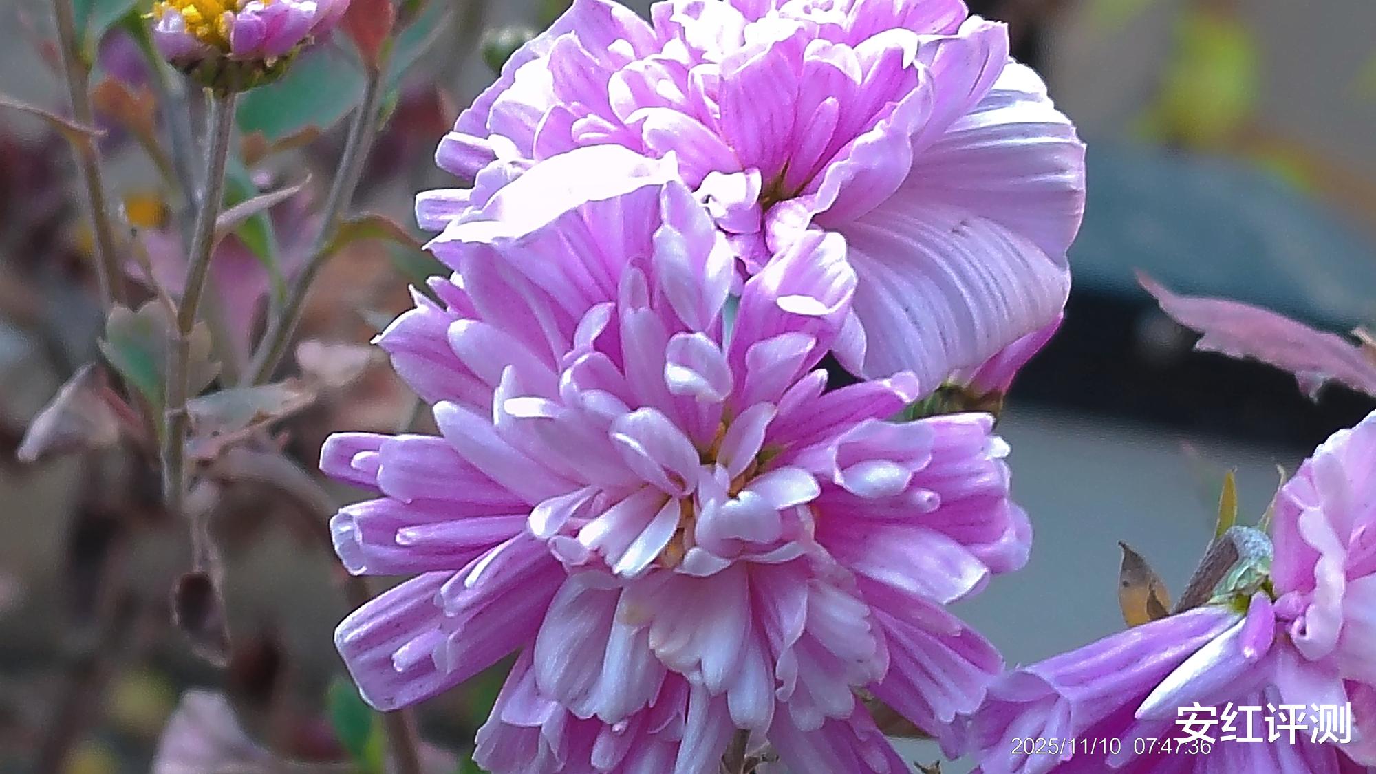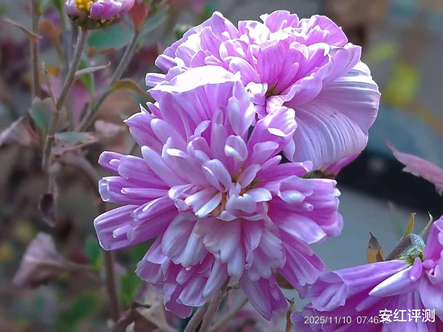 同时松典VE418内置5轴防抖,使得前置主摄支持电子防抖,并支持自动对焦,拍照能力有了明显提升。看下拍照样张,直出原图。阳光下的花朵,紫色花瓣绽放,花蕊略呈现秋冬干燥的景象。画面层次感比较突出,各花瓣明暗交替,脉络清晰可见,真实自然,尤其是断裂的花瓣细节表现更加丰富。
