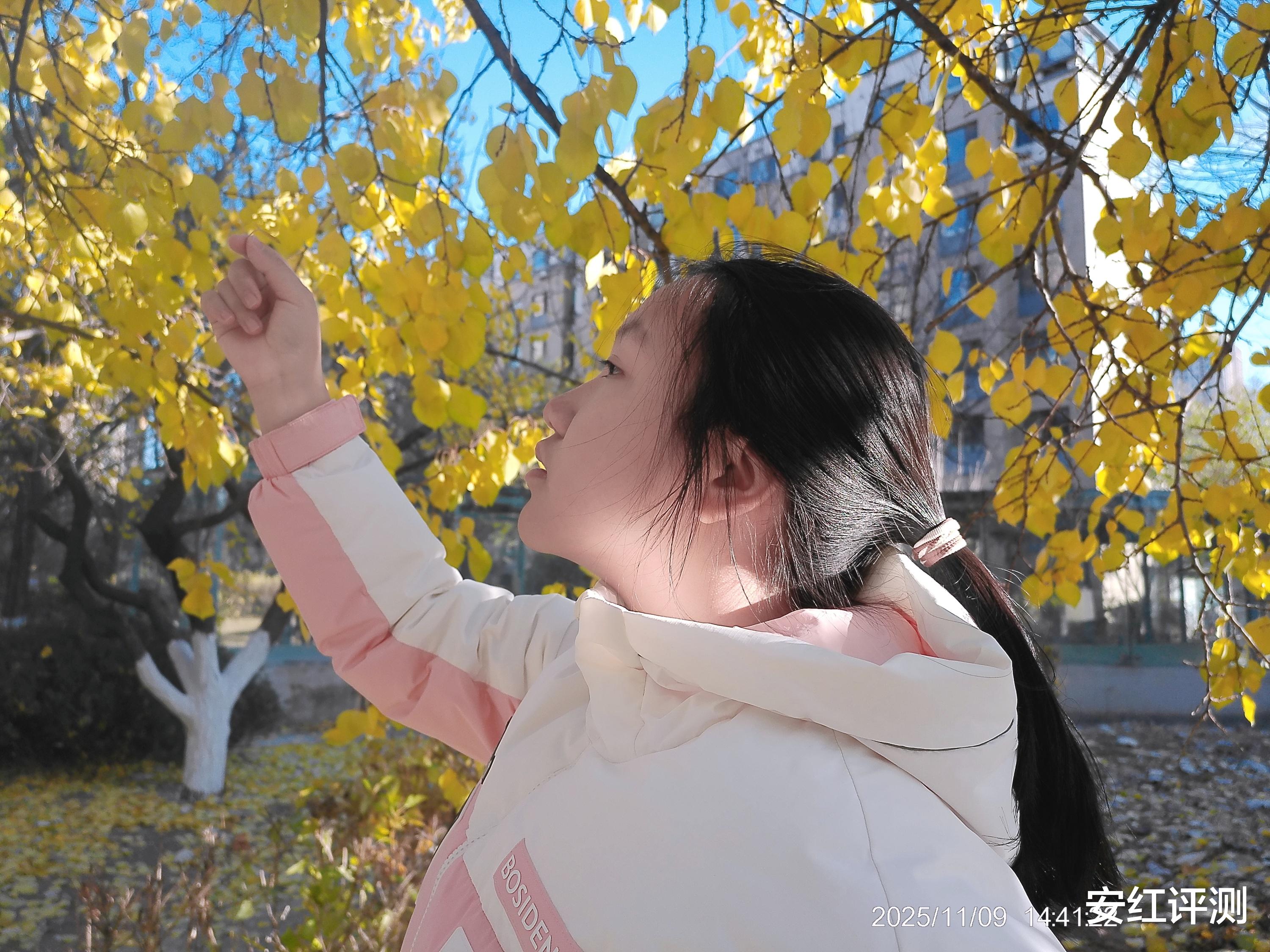 人像随手拍,能够自动识别人脸,聚焦清晰,也带来了自然的虚化效果,树木、建筑和天空一起变成了背景,突出人物地位,主次分明,过渡自然,人物与画面中的树木、建筑相得益彰。同时在强光环境下曝光自动平衡,人脸、发丝高光部分与树丛阴影兼顾。整体画面更具空间感,堪比现实。