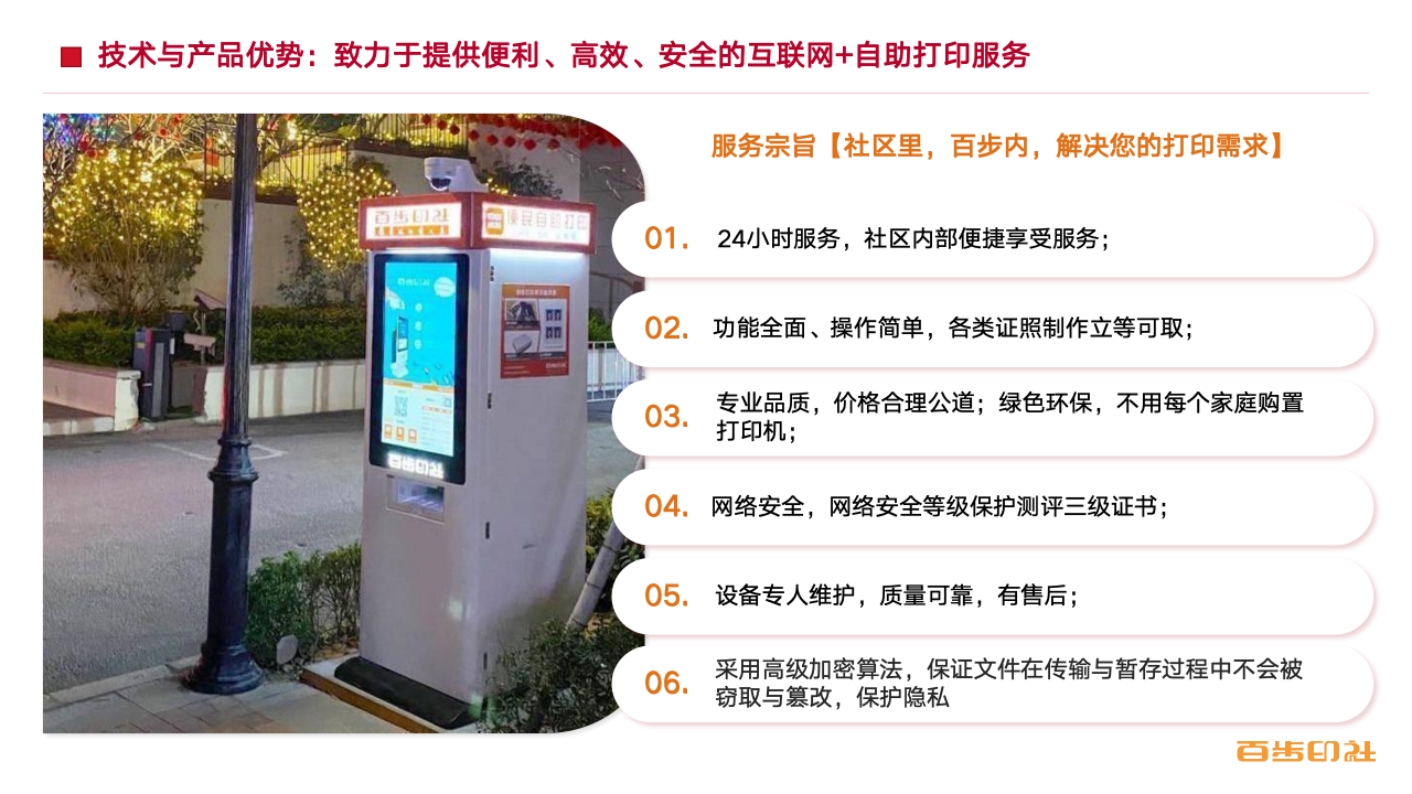 展望未来,社区服务的竞争力正体现在对居民“最后一米”生活需求的洞察与满足上。像打印这样看似微小却高频刚需的服务,正是构建“一刻钟便民生活圈”不可或缺的拼图。百步印社愿成为物业企业最可靠的合作伙伴,以遍布全国的设备网络与成熟可靠的运营经验,共同将社区空间打造得更便捷、更智能、更具温度。