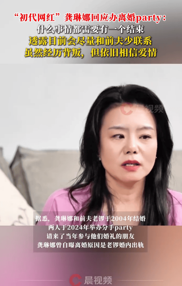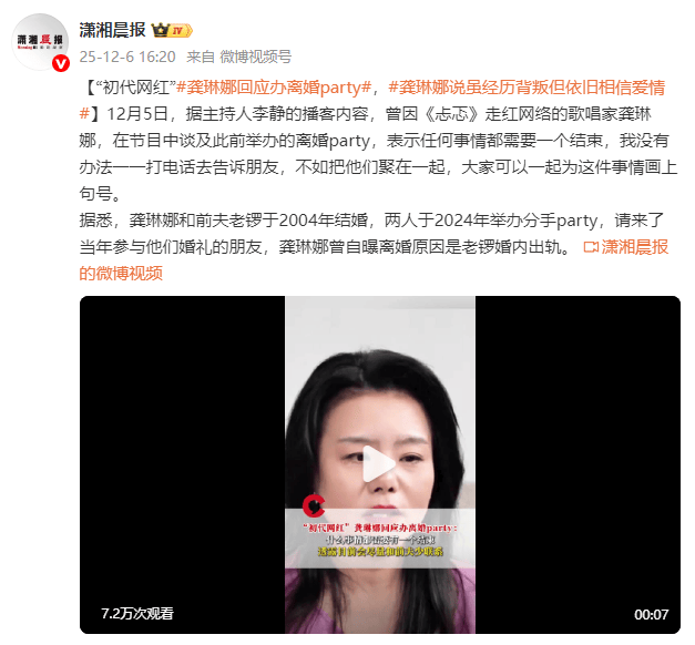 据悉,龚琳娜和德国作曲家老锣2024年在德国举办了一场“分手派对”,邀请了20年前见证他们婚礼的亲友。在派对上,老锣弹琴伴奏,龚琳娜再次唱起了那首定情曲《自由鸟》。