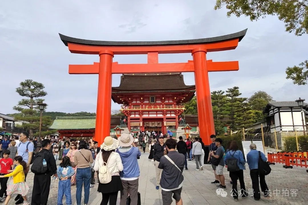 2025年4月20日下午,我游览完平等院以后,乘坐火车离开宇治市,返回京都市,途经稻荷站。走出繁忙的车站东门,迎面是高大的红色鸟居,下方是通向伏见稻荷大社的表参道。这里坐东朝西,背山面水,香火旺盛,游客云集,热闹非凡。