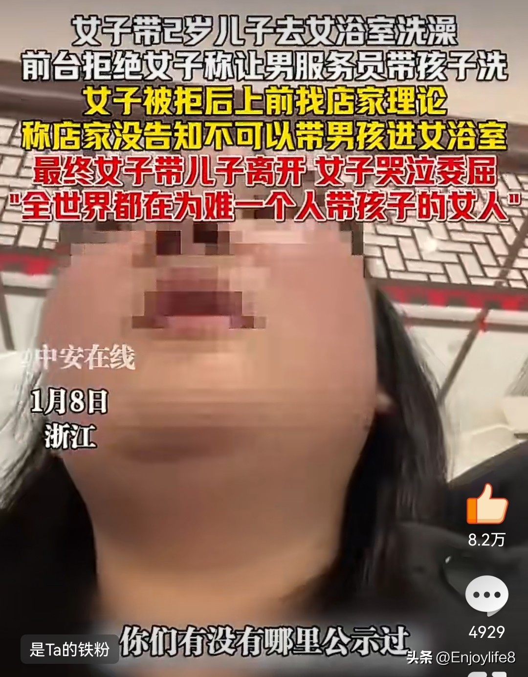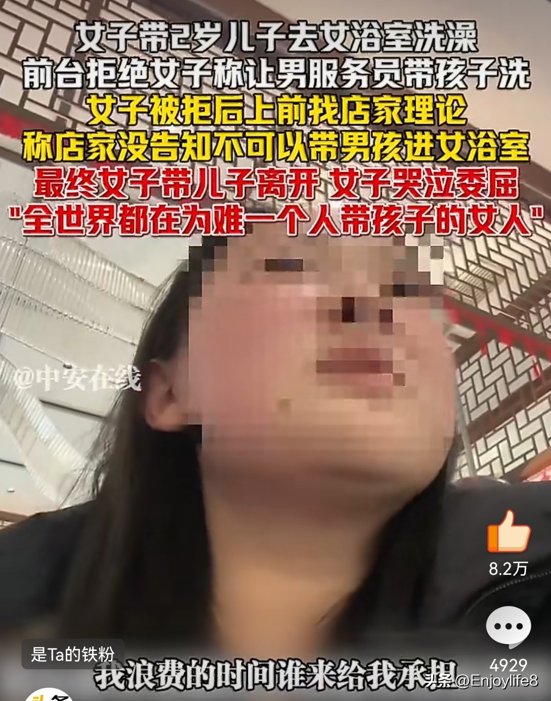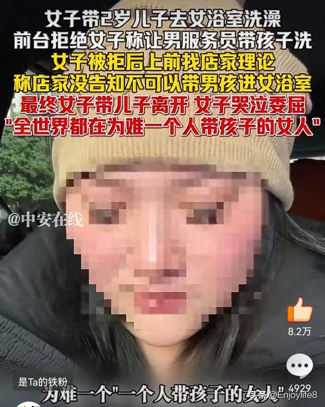 1. 中安在线:《女子带2岁儿子去女浴室遭拒,委屈痛哭:全世界都在为难一个人带孩子的女人》