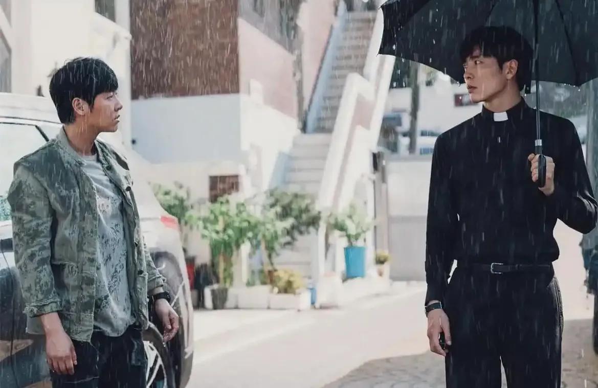 但《鬼客》最打动人的,从来不是恐怖元素,而是三位主角的“抱团取暖”。灵媒尹华平,童年被恶鬼朴日图附身,亲眼看着母亲和奶奶惨死,一辈子都背着“罪人”的枷锁;神父崔允,小时候目睹哥哥被附身屠杀全家,自己侥幸存活,从此走上驱魔之路,却要时刻忍受驱魔的痛苦;刑警姜吉英,母亲是被恶鬼杀害的警察,她带着仇恨和执念入行,起初根本不信鬼神,直到亲眼见证离奇案件。