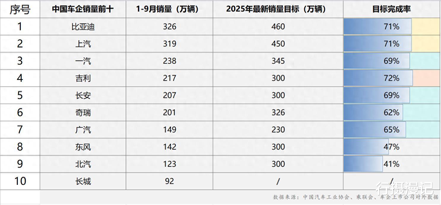 从销量前十车企的竞争格局来看,比亚迪与上汽集团共同占据第一梯队位置,1-9月累计销量均突破300万辆。其中,比亚迪以326万辆的累计销量稳居行业榜首,已顺利完成其全年460万辆最新销量目标的71%,凭借在新能源领域的技术优势与产品矩阵,持续巩固行业领先地位。上汽集团同期累计销量达319万辆,全年目标完成率同样为71%,在燃油车市场稳步推进、新能源车型加速布局的 “双线并行” 策略下,保持了稳健的增长节奏。