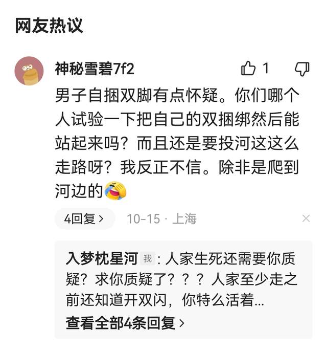 山东33岁男子自捆双腿跳河,再一次 引发社会关注,有人感到同情和悲哀,觉得他是某些社会问题的牺牲品;也有人表示不理解,认为自杀是一种不负责任的行为,不仅对自己造成了伤害,也给身边的人带来了痛苦和困扰。而更多的人觉得这不仅仅是个人问题,也是越来越普遍的社会问题,希望能引起足够的反思和改变。