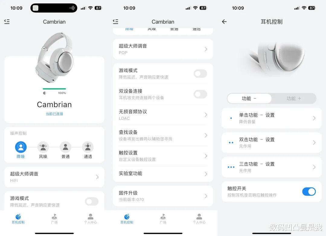 耳机机身除了电源键还有降噪模式切换、音量等按键,并且配有3.5mm音频接口,搭配原装线可切换成有线模式,耳罩面板支持触控调节,调节方式可根据使用习惯在RoseLink APP中进行设置,此外APP还能调节降噪模式、EQ设置、开启游戏低延迟模式等。