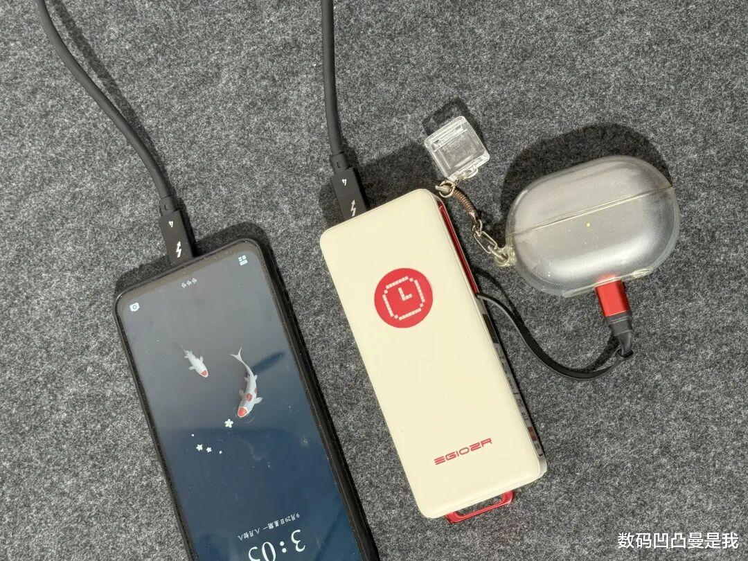 充电宝支持45W快充输出,机身还配有USB-C口,可与自带的快充线同时输出,值得一提的是还内置无线充电模块,可为Apple Watch进行磁吸充电,不仅可以少带一个充电器还能三台设备同时充电。自带快充线和C口也都支持27W自充,回电速度快。