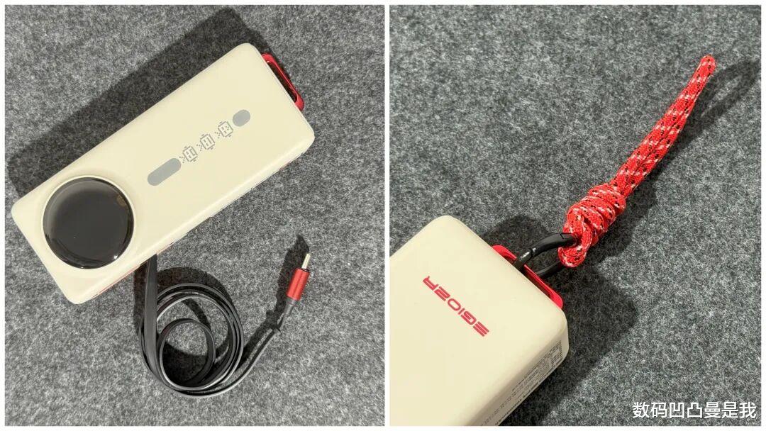 这款充电宝有一个非常好的地方时自带70cm快充伸缩线,使用时拉出,用完缩回,70cm线材加上伸缩设计既能保证长度也不用担心缠绕,比一般的比短线用起来更方便,再搭配原装的挂绳,外出可直接挂在背包上给手机充电,不用手持更省事。