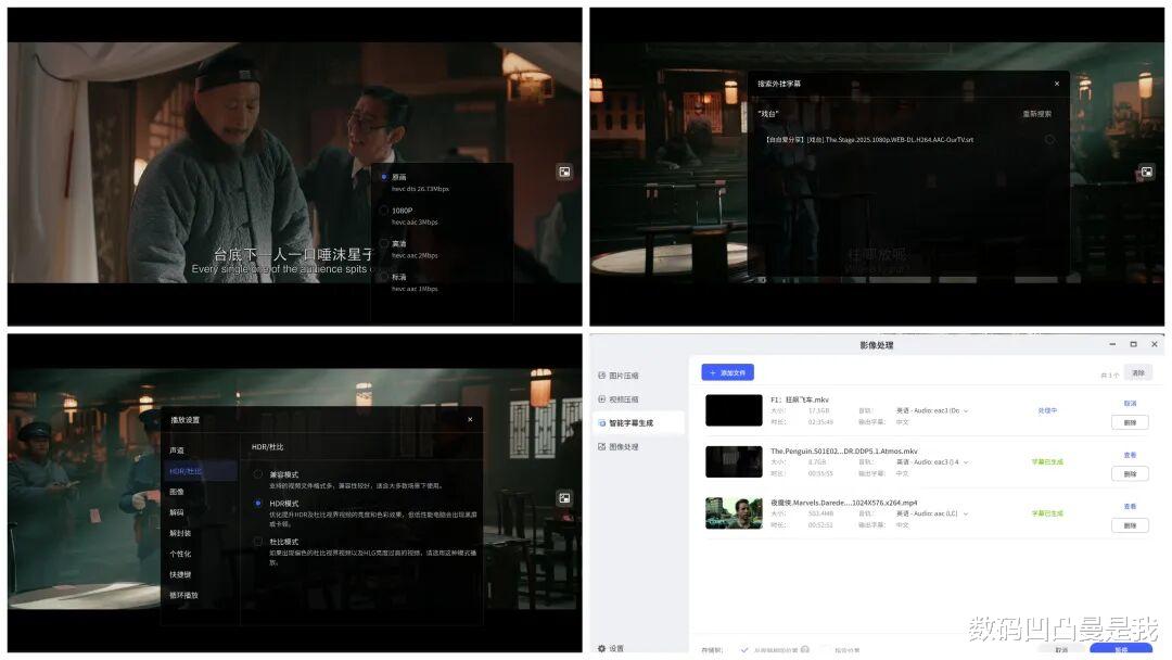 极空间自带的播放器体验也是不一般的好,不仅具备强大的解码能力支持MKV、ISO、BDMV等蓝光原盘格式,还能切换码流、音轨、解码方式等。字幕功能也相当实用,可切换内置字幕、添加本地字幕、在线搜索外挂字幕,搜不到的字幕还能通过影像处理的智能字幕生成功能生成中文字幕,再也不用到处搜索字幕文件了。