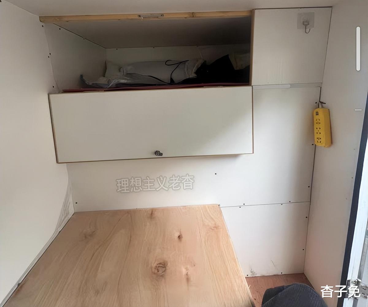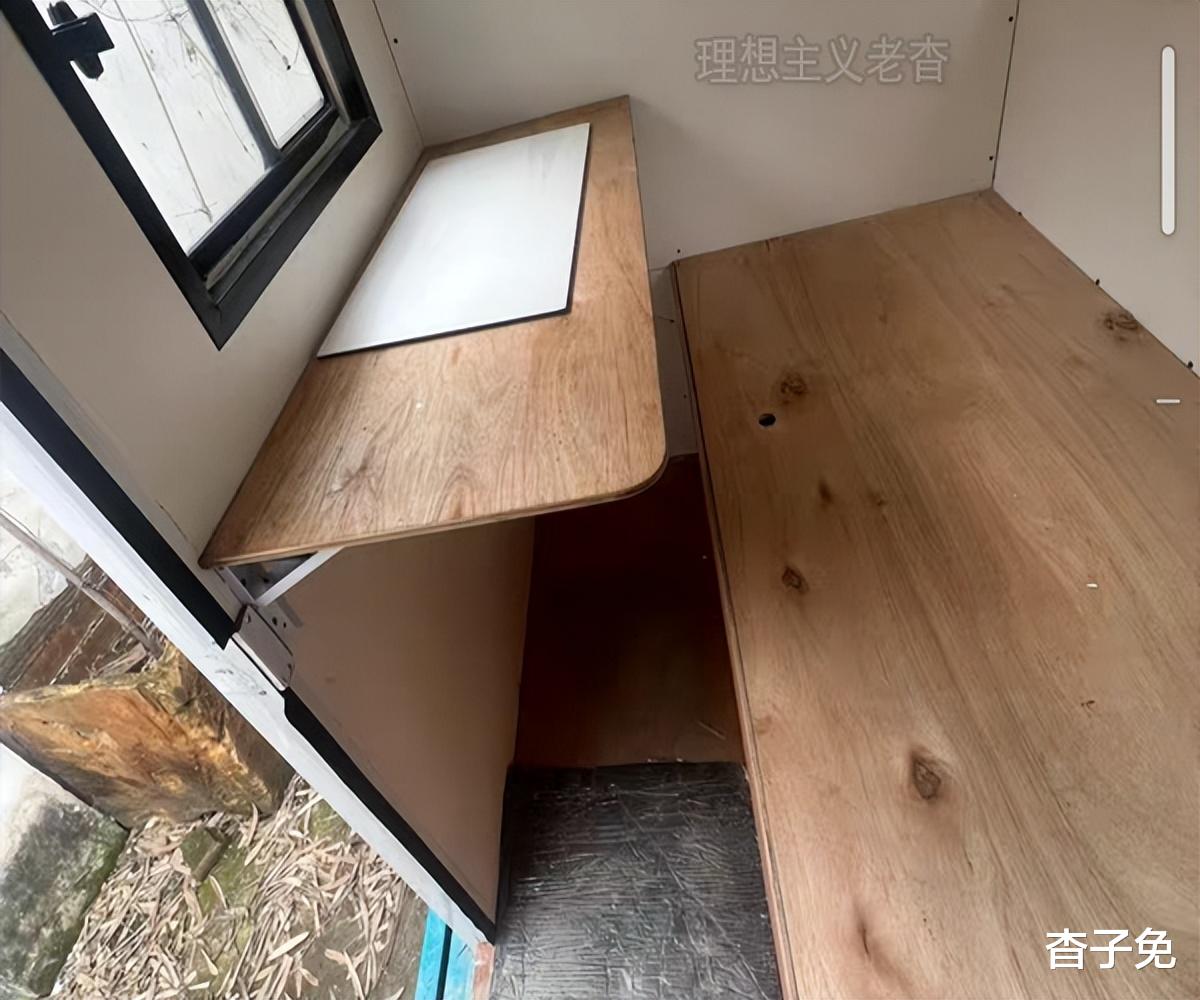纵向木制单人床是箱内主要生活设施,右侧是靠窗折叠桌,是日常吃饭办公之地。