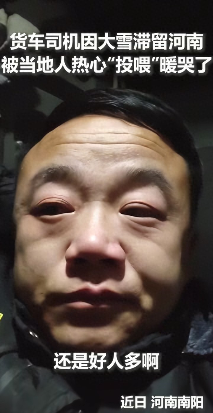 1月23日(报道),南阳市南召县。山东德州籍司机因大雪滞留在南召,被当地村民热心照顾的事迹戳中无数人的心房。当时,由于大雪导致路面湿滑,无法前行,货车司机王师傅只能靠边停放,下午在车上睡觉的时候,有位大姐敲了他的车门,邀请他去家里吃饭,王师傅想着,自己都不认识人家,说“车上有方便面”婉拒了。