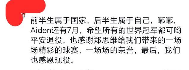 最后用网友的一句话结束:前半生属于国家,后半生属于自己,嘟嘟、Aiden还有7月,希望所有的世界冠军都可以平安退役,也感谢郑思维给我们带来的一场场精彩的球赛,一场场的荣誉,最后我们也感恩现役。