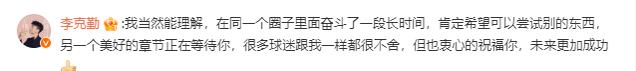 李克勤表示:我当然能理解,在同一个圈子里面奋斗了一段长时间,肯定希望可以尝试别的东西,另一个美好的章节正在等待你,很多球迷跟我一样都很不舍,但也衷心的祝福你,未来更加成功!