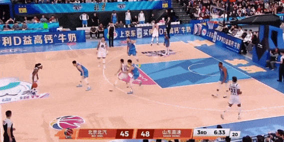 利用陶汉林的掩护,持球推进,一看周琦是下腰沉退防守,珀塞尔就在中距离拔起中投,