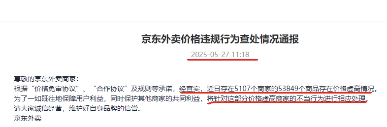 十天后5月27日中午就出处罚通知了,要杀鸡儆猴了。经查实,近日存在5107个商家的53849个商品存在价格虚高情况。将针对这部分价格虚高商家的不当行为进行相应处理。通知还是一如既往的和东子一样不要脸,打着用户和商家的名义处罚商家,按霸王条款那就要对这5107个商家进行罚款。前一阵子京东没钱补贴打价格战了就要逼商家承担给用户的补贴的一半,现在直接要商家在原价售价起送价打包费做到全网最低,做不到就要罚款。