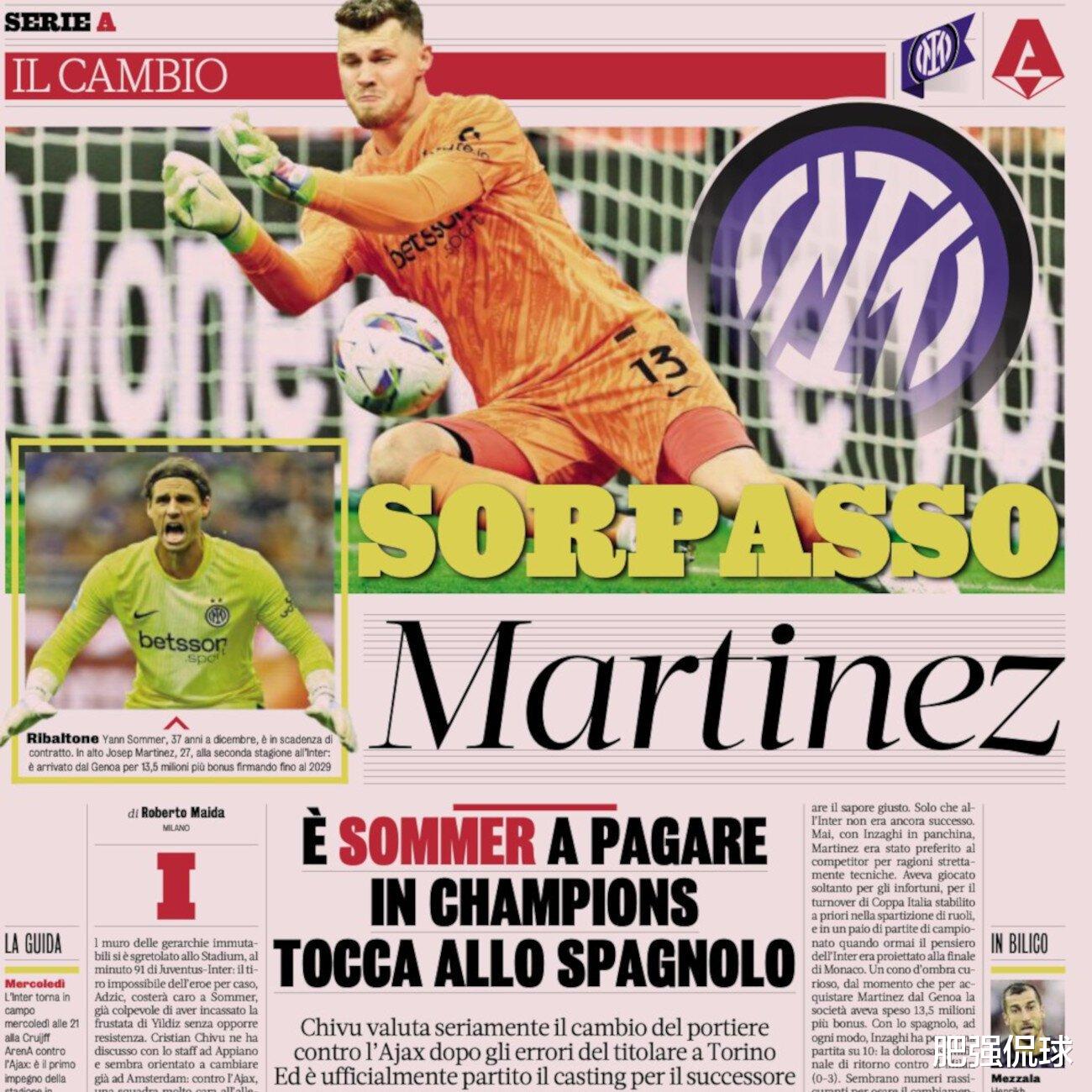 而且,这并不是普通的例行轮换,而是事关门将换代的位置更迭!赛季初,管理层与教练组制定了两位门将的使用计划,不再是单纯让马丁内斯在意大利杯和索默伤停时出战,而是更频繁轮换,让马丁内斯获得更多出场机会,以获得更充分的考察机会,在赛季末之前明确明年夏窗的引援计划。