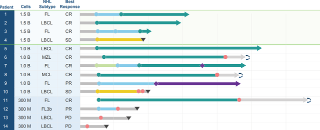 在两个较高剂量组中,非霍奇金淋巴瘤(NHL)患者的总缓解率(ORR)为80%,完全缓解率(CR)为70%,其中大B细胞淋巴瘤(LBCL)患者的完全缓解率达到50%。