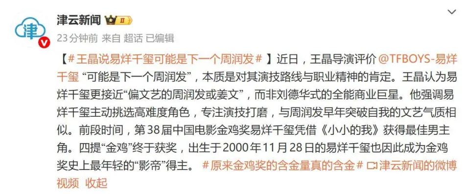 “00后演员里,他是最有希望成为下一个周润发的!” 近日,导演王晶在社交平台发布视频,公开力挺易烊千玺,称其 “专注演技打磨、挑战高难度角色的路线,与早年周润发的职业路径惊人相似”,甚至给出 “更偏文艺一点的周润发或姜文” 的超高评价。这番言论恰逢易烊千玺以24岁11个月的年龄斩获金鸡奖最年轻影帝,网友直呼 “这波盛赞不是捧杀,是实力配得上”。