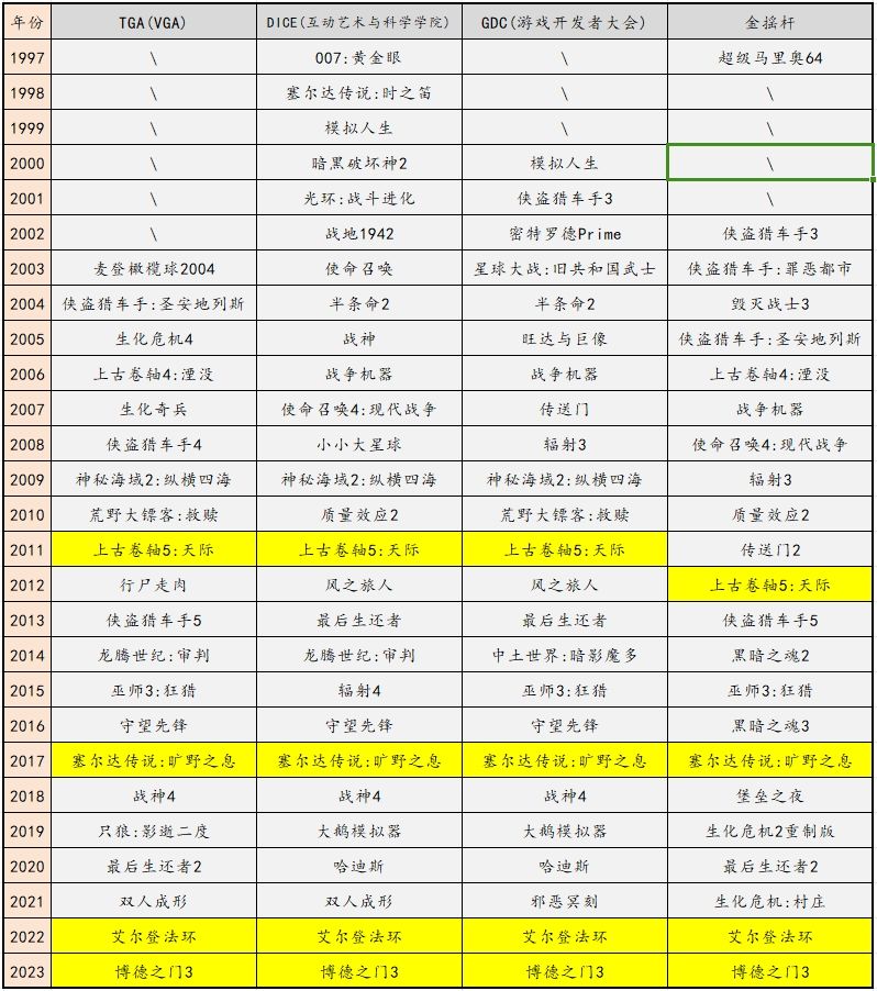 从TGA、DICE、GDC、金揺杆历届(2003年开始)年度游戏可以看出: